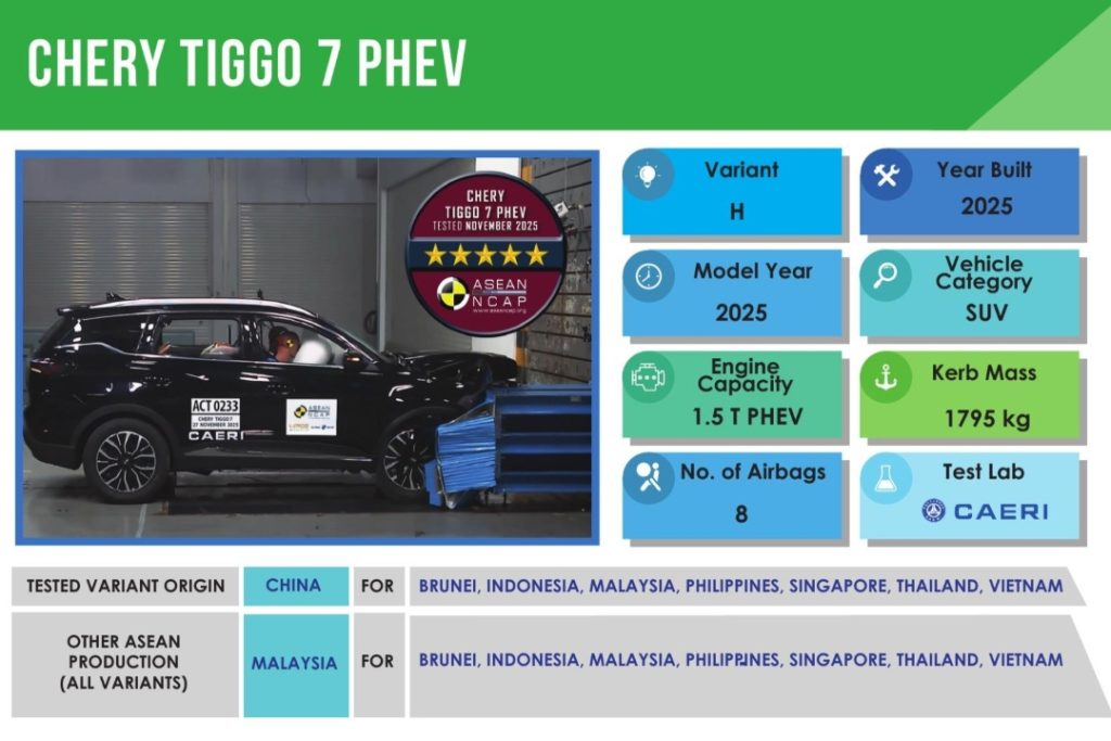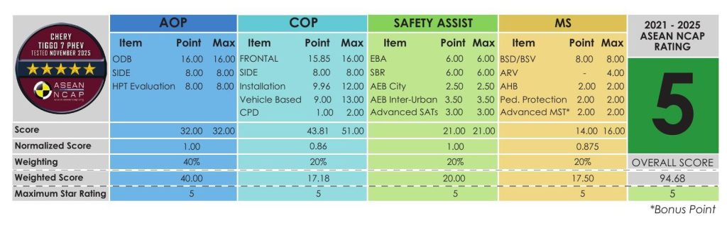 Chery Malaysia has announced that the Chery TIGGO 7 PHEV has secured a 5-Star ASEAN NCAP safety rating, achieving an overall score of 94.68 points under the ASEAN NCAP 2021–2025 assessment protocol.