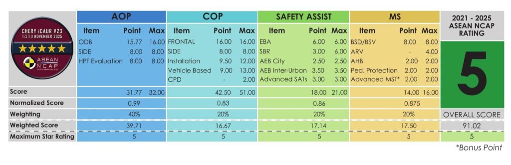Under the 2021–2025 ASEAN NCAP protocol, the iCAUR V23 scored: