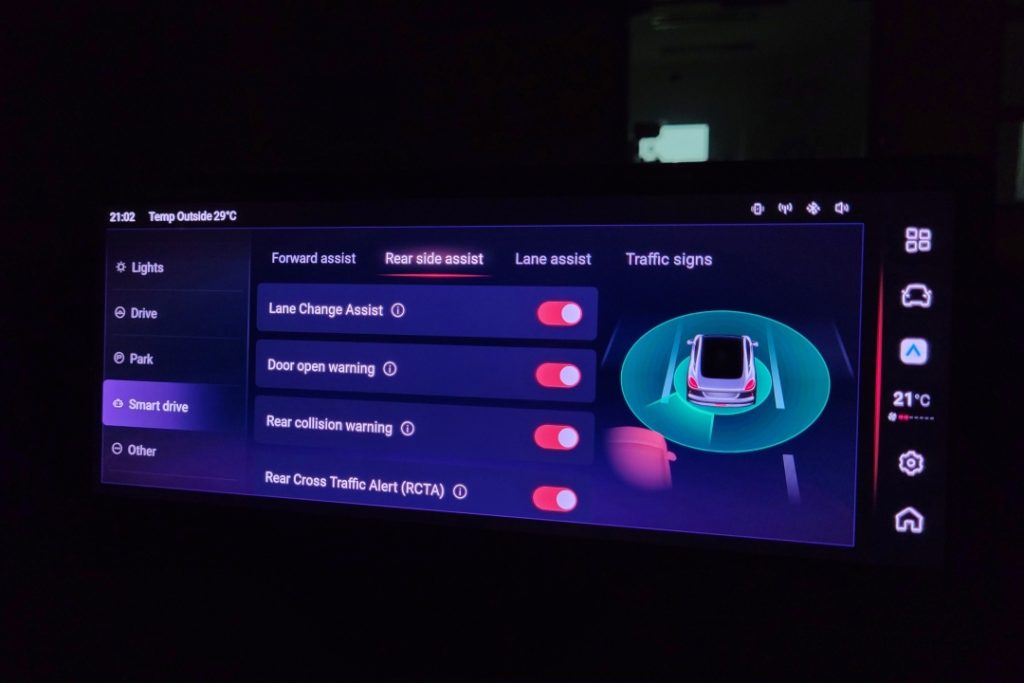 The Ora 07 comes loaded with ADAS, including adaptive cruise control (stop-and-go), lane departure warning, lane keeping assist, automatic emergency braking, blind-spot monitoring, rear cross-traffic alert, and driver fatigue monitoring.