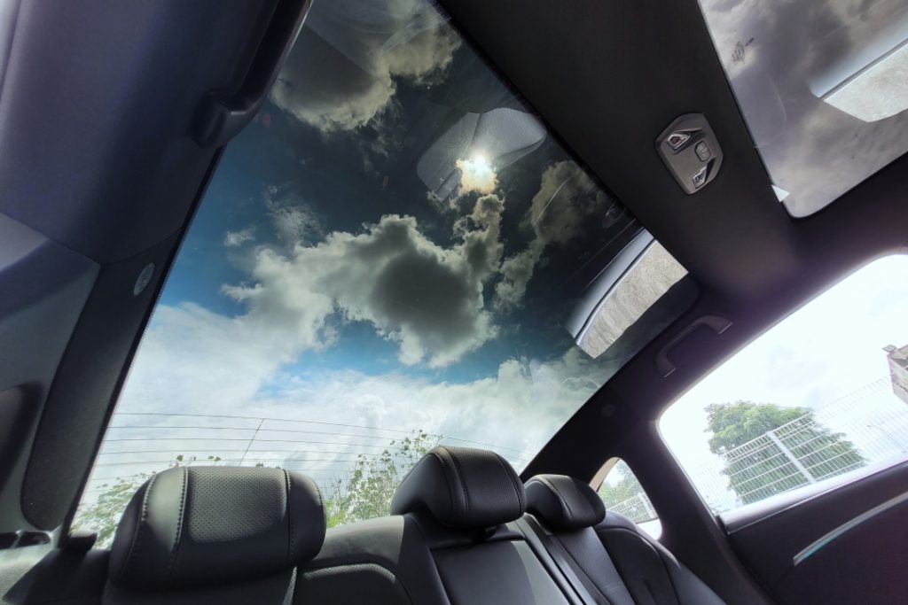 Rear passengers enjoy ample legroom despite the sloping roof, with supportive synthetic leather seats and chunky headrests. The only compromise is limited rear visibility when all three rear seats are occupied.
