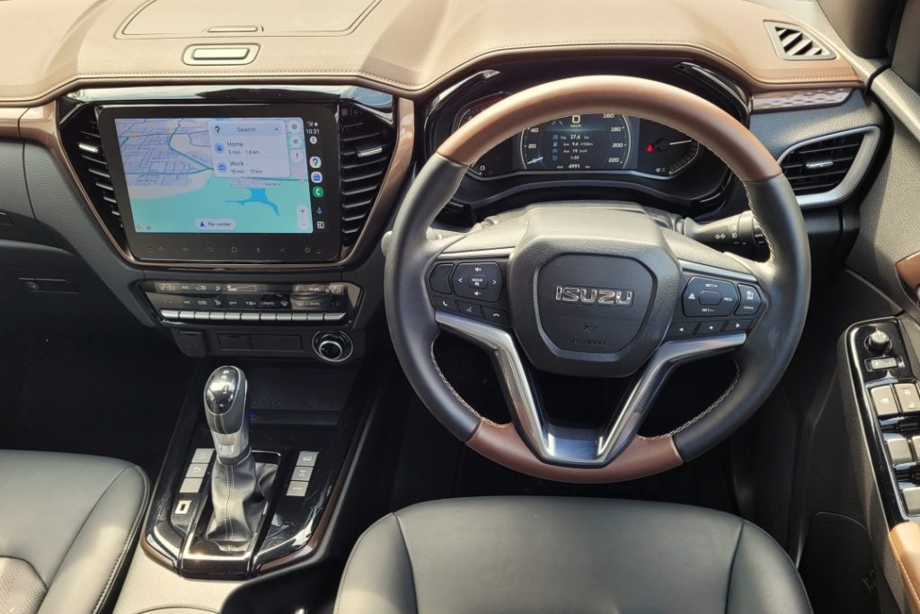 The dashboard and door trims feature Isuzu’s “Miura” design theme inspired by Japanese origami, while soft-touch materials and brown leather accents lift the overall ambience. The two-tone leather-wrapped steering wheel and ambient lighting add a touch of flair without going overboard.