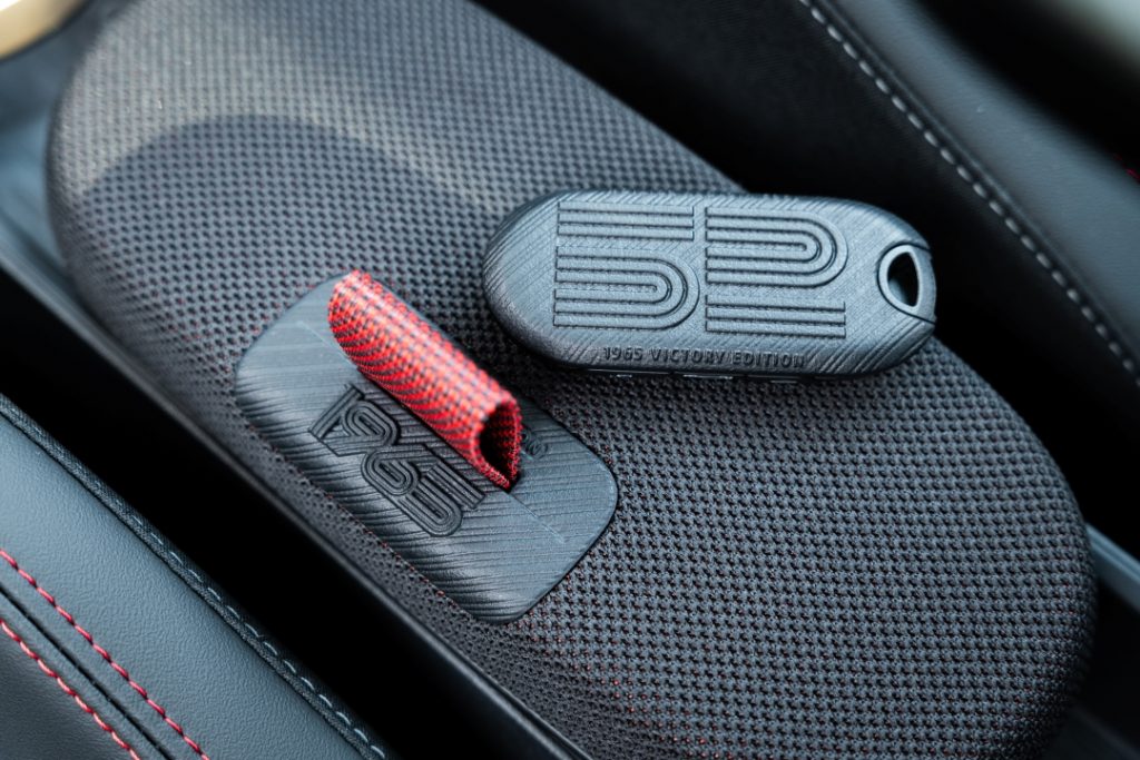 Visually, the car is immediately distinctive. Finished in Chili Red with a white racing stripe stretching from the bonnet to the rear, it also features the historic number “52” in white graphics on the doors, directly referencing the original rally-winning car.